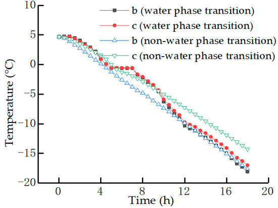 The curves in Figure 3 demonstrate the temperature of the analyzed points b and c as a function of time. It can be observed that at the water phase transition, the internal temperature change of the pavement surface is nonlinear, whereas the temperature change is linear at the nonwater phase transition. The nonlinearity of temperature change at the water phase transition is due to the fact that when the internal temperature of the pavement surface drops to about 0 °C, the water freezes and releases latent heat, and thus, the temperature can be maintained for a period of time without dropping. This phenomenon does not occur at the nonwater phase transition. However, regardless of whether a phase change occurs or not, the temperature of the surface layer always lags behind that of the lower layer.