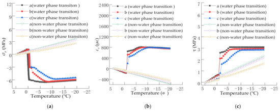 It can be seen from Figure 4c that although the shear stress at the water phase transition and the nonwater phase transition increases with the decrease in temperature, the change law is different. At the beginning of cooling, the shear stress at the water phase transition and the nonwater phase transition fluctuates linearly with a decrease in temperature. When the temperature reaches the water phase transition point, the shear stress during the water phase transition increases sharply. The shear stress continuously increased and tended to be stable at –10 °C with the decreased temperature. However, the shear stress during the nonwater phase transition increases linearly with the decrease in temperature. At the water phase transition, when the water in the voids freezes and expands, the shear stress at point a is the largest, followed by that at point b, and point c is the smallest, with the maximum values of 3.11, 2.91, and 2.28 MPa, respectively. The maximum shear stress at the nonwater phase transition is 2.31 MPa, which is 0.75 times that at the water phase transition.
