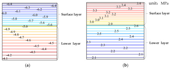 Cloud chart of the horizontal stress (in MPa) varying with the pavement depth; where (a) is the case of the water phase transition, and (b) is the case of the nonwater phase transition.