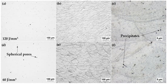 The LOM images of the samples after etching are presented in Figure 2b,e, in which the individual melt pools are clearly visible. The higher laser power of the 60 J/mm3 sample together with a larger hatch distance resulted in less overlap in the melt pools, thus penetrating deeper into the material []. Darker fields along the melt pool boundaries are visible for both energy densities, suggesting preferential etching and thus a higher concentration of precipitates in these regions. More overlapping of laser scanning tracks leads to more melt pool boundaries being present in the sample process with 120 J/mm3. A higher magnification of the LOM images (Figure 1c,f) of the two samples after etching highlights the similarities in the melt pool structures. In these two images, other defects such as inclusions and porosities are visible; however, it is difficult to distinguish them from each other in LOM images alone.