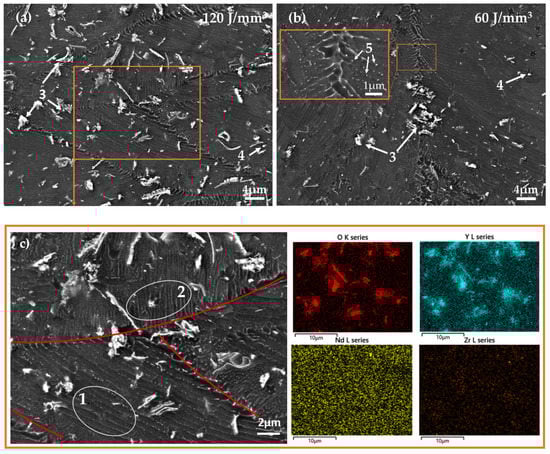SEM images, where (a) corresponds to the samples processed with an energy density of 120 J/mm3 and (b) corresponds to the samples processed with an energy density of 60 J/mm3. The melt pool boundaries and the columnar structure are highlighted in image (c), corresponding to the boxed area in (a). The EDS maps correspond to the same area. Nr 1 and 2 highlights the orientation of the columnar structure observed in different parts of the melting pool. Nr 3 corresponds to areas rich in Y and O, and 4 to particles rich in Zr. Nr 5 are precipitates at the boundaries of the columnar structures.