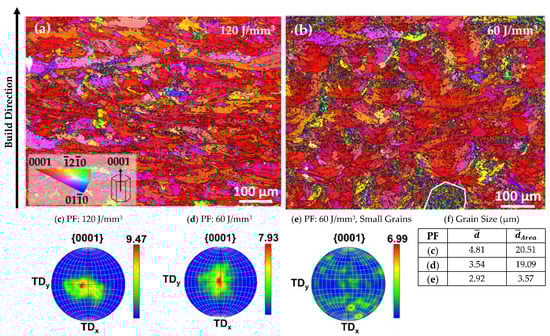 EBSD orientation map of (a) a sample produced with 120 J/mm3, (b) a sample produced with 60 J/mm3, with an area with a smaller grain size circled. An IPF color key valid for both maps is inserted in (a). In both maps, the IPF color is set to represent the crystallographic direction in the transverse plane in order to highlight the strong basal texture. This corresponds to the grains having the crystallographic orientation represented in the schematics of the hcp unit cell, i.e., a red colour means a crystal orientation of 0001 in the build direction. (c–e) include the PFs for the 120 J/mm3 sample, 60 J/mm3 sample, and the area with smaller grains circled in (b,f), respectively. The grain sizes are defined for the areas related to the three PFs. The build direction is upward in the images.