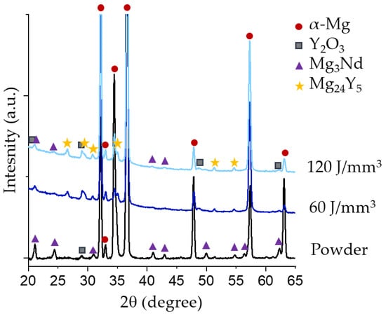 No differences were observed between the XRD spectra obtained for the two samples (Figure 5). Analyzing the XRD spectra, most peaks correspond to α-Mg. Peaks corresponding to Y2O3 were found in the spectra for the processed material, although not in the spectra of the powder. The oxygen- and yttrium-rich regions observed in the EDS are thus likely be Y2O3. Peaks corresponding to Mg3Nd were found in both spectrums. Moreover, in the printed material a number of peaks and shoulders that could be related to Mg24Y5 were established. The difference in relative intensity between the α-Mg peaks in the spectra of the processed material is different from that of the powder. This change in relative intensity of the peaks is related to the strong texture in the processed material [].