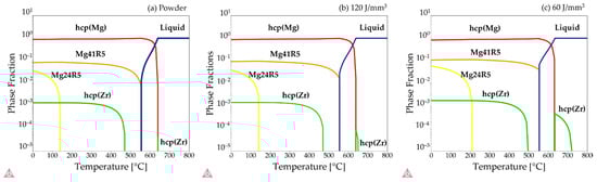 Calculated property diagrams showing the equilibrium phase fraction as a function of temperature for the alloying content given in Table 3 for (a) the powder, (b) the sample printed with ED = 120 J/mm3, and (c) the sample printed with ED = 60 J/mm3, using the Thermo-Calc TCS Mg-based alloys Database version 5.0 [,].