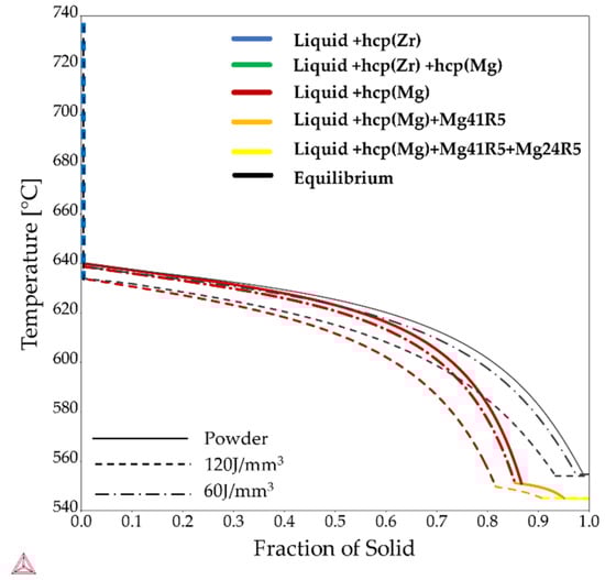 Scheil–Gulliver simulation showing the solidification paths in comparison to equilibrium for the alloying contents given in Table 3, using the Thermo-Calc TCS Mg-based alloys Database version 5.0 [,]. The higher thermal stability of the hcp-Zr observed in the equilibrium phase diagram is also visible in the calculated results of Scheil–Gulliver simulations for the sample printed with 120 J/mm3, where it corresponds to the green line. However, the temperature interval was too small to be visible in the graph.