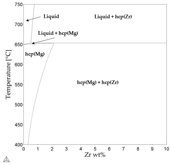 As there is no evidence of Zr rich forming intermetallic compounds in the Mg-Y-Nd-Zr system and due to the low solubility of Zr in α-Mg, the Zr particles observed with EDS are assumed to be hcp-Zr []. Zr is a common nucleation agent added to Mg-alloys to obtain grain refinement; thus, there are many studies investigating the precipitation of hcp-Zr particles and its influence over the solidification behavior of Zr containing Mg alloys [,,]. The experimental investigations carried out on the binary Mg–Zr system shows the precipitation of the hcp-Zr in the liquid melt as well as the dissolution of hcp-Zr in the α-Mg matrix [], which can be seen in the Mg-Zr binary phase diagram (Figure 9) as well. With respect to the amount of Zr in the alloy investigated here, hcp-Zr is expected, as predicted by the equilibrium and solidification calculations. However, the mechanisms by which precipitation and dissolution of the hcp-Zr particles occurs and the mechanism behind their effect as a grain refiner in Mg alloys is complex and not very well understood. Thus, more data are needed in order to accurately describe the precipitation behavior of Zr in this system.
