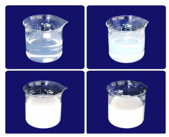 Colloidal silica has a negative charge strip in amorphous silica (SiO2), which constitutes fine particles in colloidal water and is apparently a totally transparent or translucent white shade in a solution of water. In a dispersion medium, it is distributed to the shape of colloidal silica, which implies partial stabilizers including a state of colloidal silica. If Colloidal silica’s fine particles are 7 nm or smaller, then consequently, colloidal silica’s appearance is transparent or similar to water; 10~30 nm is another transparent case, and an approximately 50 nm particle size becomes a white, milky color which are shown in Figure 1. In addition, a particle size of 10 nm for colloidal silica was selected, and 2, 3, and 4% were proposed as appropriate mixing amounts.