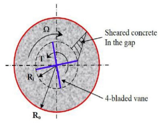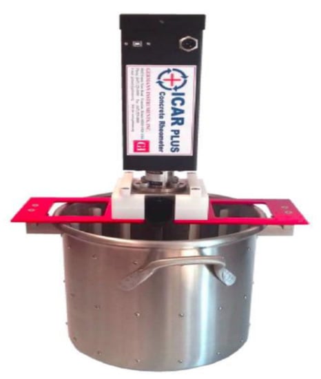 There are a few rheometers, such as IBB, ICAR, and Btrheom rheometers. Among these, the ICAR rheometer was used in this study. The ICAR rheometer was first evolved as a rheology measurement from the University of Texas in Austin and thereafter produced by a German company in Denmark for the flow behavior of concrete mixtures. This test device mainly includes or consists of a container that can hold concrete before hardening, an electric motor, a torque meter, a four-blade vane that is held by the chuck on the driver, a frame to attach the driver/vane assembly to the top of the container, attaced containers and head equipment that send measurement data in real-time to a computer, and finally, a program to analyze the test data. In the real-time record, the test apparatus is used to evaluate the yield stress and plastic viscosity for flow curves [15]. Following that, the Bingham parameters are automatically calculated on the basis of those rheological data. As shown in the graph, rotational velocity is signified by the X-axis, while torque values are indicated by the Y-axis. The values of the descending rotational vane speed and torque are demonstrated and linearly assessed to determine the concrete’s rheological behavior. Figure 3 and Figure 4 depict the ICAR Rheometer and the cylinder center axis.