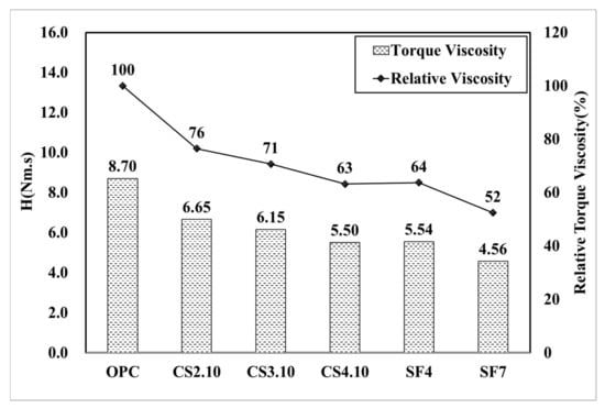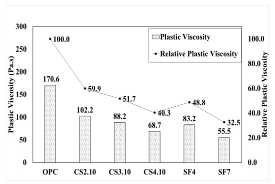 Figure 11 graphically shows the analysis result of the torque viscosity (H) in all experimental mixing ratios. With OPC as a reference variable, the torque viscosity decreased by 24% in CS2.10 and decreased by 37% in CS4.10. It was confirmed that the torque viscosity (H) decreased as the mixing ratio increased. Herein, we attempt to briefly describe the plastic viscosity using the Bingham model. The Bingham model shows the analysis result for plastic viscosity (µ). As per the reference variable OPC, the plastic viscosity decreased by 40% in CS2.10 and decreased by 60% in CS4.10. Therefore, the same behavior is also shown in the Bingham model in Figure 12. Figure 11 shows the analysis result of torque viscosity H according to the silica fume mixing ratio. Torque viscosity of SF4 decreased by 36% compared to OPC, and SF7 decreased by 48%, resulting in silica. It is considered that a high level of the pumping property can be secured when silica fume is incorporated with concrete. The Bingham model result also achieved the same behavior with more usable data because of the more effective linear data.