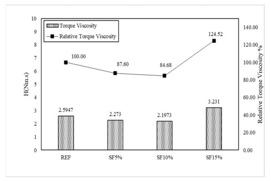 Figure 17 and Figure 18 graphically show the analysis results for torque viscosity H and plastic viscosity µ. The torque viscosity decreased by 12.4% and 15.32% according to SF5 and SF10, respectively. It was confirmed that the torque viscosity H decreased as the mixing ratio increased. This was also observed in our research. However, there is more to note in SF15. Its behavior is completely different from others; its torque viscosity spontaneously increased to 124.52%. The results of the Bingham model’s plastic viscosity are the same as the rheology data. Meanwhile, the flow resistance, G, and yield stress gradually increased as per the proper behavior such that SF5 to SF10 is 26.78% and SF15 is 95.36% according to the flow resistance, which is shown in Figure 19 and Figure 20. Moreover, yield stresses saw the same type of increase as per the increasing mixing ratio.