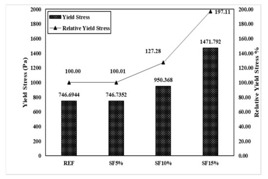 Torque viscosity (H) from REF is 2.59 Nm.s, which is measured using the IBB rheometer and SF5, SF10, and SF15 torque viscosity H were measured accordingly as 2.27 Nm.s, 2.1973 Nm.s, and 3.23 Nm.s. Meanwhile, in RFE, the flow resistance (G) was measured to be 5.5904 Nm. It was measured to be 5.49 Nm in SF5, 6.988 Nm in SF10, and 10.822 Nm in SF15. Based on the Bingham model, the results also showed the same behavior. Herein, we also observe that the increasing percentage of silica fume caused a remarkable change in the plastic viscosity and shear stress. Plastic viscosity gradually decreased, implying that it is more workable and more pumpable; however, yield shear stress increased gradually, leading to the initiation of the initial flow with good flowability. The only remarkable behavior was exhibited by SF15 because its plastic viscosity and yield stress are higher than those of the others. Herein, we also need to explain that our test results and Jeon’s results have some significant differences due to the rheometer. However, when these data changed in the Bingham model, the behavior of the data remained the same. Therefore, the Bingham model conversion is more effective than the rheometer data.