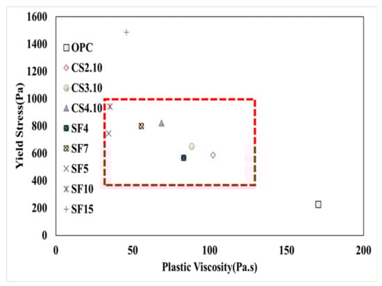 Shotcrete’s pumping properties are mainly dependent on the material rheological properties, equipment performance (pumping rate of 4.6 m3/h), and hose diameter of the shotcrete technology. In this study, the rheological characteristics were measured using an ICAR rheometer with a coaxial vane. The size of the drum is reflected in the measurement of the shotcrete torque as well as the distance to the wall. Therefore, the measurement factors are different for every rheometer. Figure 22 shows research data and Jeon’s data. However, Jeon used an IBB rheometer while an ICAR rheometer is used in this research to measurine the rheological parameters. However, for more effective results and comparisons, the Bingham Model was used. According to the theory of pumpability, the results depend on a good combination of yield stress and plastic viscosity. Besides that, enough fines in the mix must build up a lubrification layer, and the stability of the mix against segregation has to be tested. In this paper, only the basic rheological behavior of the mixes is investigated. Based on the pumpability characteristics, plastic viscosity decreased, then the pumping ability of the shotcrete increased. Therefore, OPC has poor pumpability because the plastic viscosity (170.6 Pa.s) and yield stress (228.2 Pa) combination is not good for pumping. Moreover, SF15 has some problems because the gap in the results is more, such as plastic viscosity (49. 11 Pa.s) and yield stress (1471.79 Pa). Besides, all the other combinations have good pumpability based on the plastic viscosity and yield stress combination. Figure 22 shows that CS2.10, CS3.10, CS4.10, SF4, SF5, SF7, and SF10 have pumpable capacity in the shotcrete process. Meanwhile, if yield stress is increased, then the adhesion quality after shooting is also increased. Moreover, Figure 22 indicates the possible recommended area (or workability box) for good pumpability with the mixes and equipment used in this research. However, the precondition in this research was enough fines for a sufficient lubrification layer and no segregation.