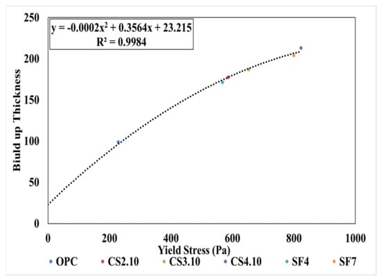 Beaupre (1994) [24] proposed the thickness of shotcrete according to the flow resistance (G). To investigate the possible build-up thickness of the different mixes, a spraying test was performed with the equipment described in Figure 2 on a vertical wall. No accelerator was used. Herein, we mainly show the relationship between the build-up thickness and yield stress because, as per the previous description, we know that the yield stress of the Bingham model has a relation to the flow resistance of the rheological data. Table 5 lists the thickness of paste based on Figure 23. The variable mixing of colloidal silica CS4.10 was applied to a thickness of 213.1 mm. Additionally, between SF4 and SF7, SF7 is more adhesive because of the build-up thickness of 204.1 mm. Meanwhile, the OPC build-up thickness of the paste is predicted to be 99 mm; thus, only the thickness of 100 mm is not secured according to Beaupre (1994). Here, we attempt to create the relationship between the yield stress and buildup thickness by drawing a polynomial line of the points, which is shown in Figure 23. From Figure 23, the points of the buildup thickness that are related to yield stress are very close. Therefore, this combination is effective to show the relationship.