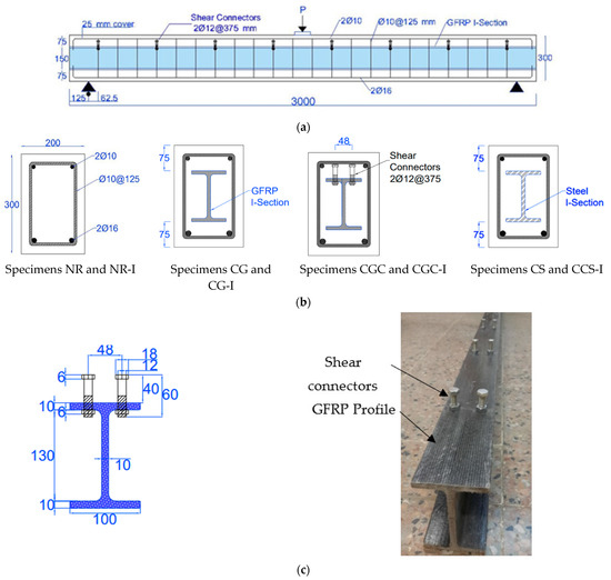 The overall length of the specimens was 3000 mm with a clear span of 2750 mm, as shown in Figure 1a. All specimens had the same cross-sectional dimensions with a width of 200 mm and a total thickness of 300 mm, as illustrated in Figure 1b. Conventional reinforcements were used for the reference specimens NR and NR-I. The flexural reinforcements were two rebars with a diameter of 16 mm in tension and two rebars with a diameter of 10 mm in compression. The transverse was stirrups with a diameter of 10 mm diameter at a spacing of 125 mm to prevent premature shear failure. The flexural and shear reinforcement were the same for the other specimens. Four specimens CG, CG-I, CGC, and CGC-I were reinforced with pultruded GFRP I-beams positioned at the centroid of the cross-section as shown in Figure 1b. Dimensions of the pultruded GFRP I-sections are illustrated in Figure 1c. Shear connectors were provided at the top flange of the GFRP I-section in specimens CGC and CGC-I to increase the composite interaction between the GFRP I-beam and concrete. The diameter of these connectors was 12 mm with a height of 70 mm and a spacing of 375 mm. The shear connectors were stiffened with washers and nuts after being inserted through drilled holes on both sides of the top flange of the GFRP I-beam. The remaining two specimens CS and CS-I were reinforced with steel I-beams positioned at the center of the cross-section as shown in Figure 1b.
