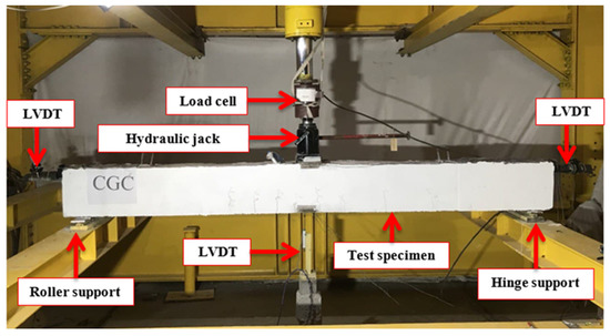 Beam specimens of group one were tested as simply-supported beams under a monotonic concentrated load at the mid-span up to failure using a 1000 kN capacity hydraulic universal testing machine, as shown in Figure 2. The applied load was monitored using a load cell with a 1000 kN capacity. Moreover, a linear variable differential transformer (LVDT) was used to measure the vertical deflection at the mid-span of the tested specimen.