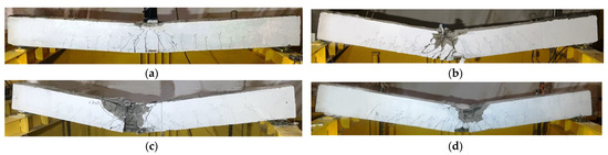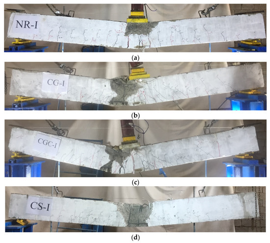 Modes of failure of the tested specimens under static test: (a) Specimen NR; (b) Specimen CG; (c) Specimen CGC; (d) Specimen CS.