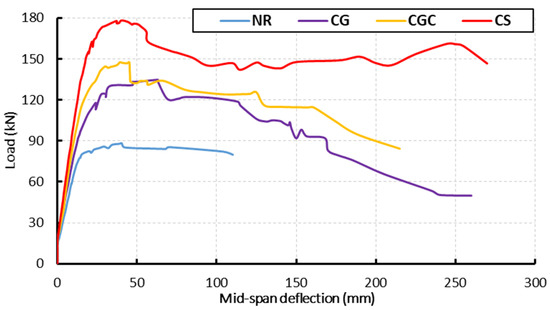 The first crack was flexural cracking and formed at the mid-spans of the tested specimens. The cracking loads of the composite specimens CG, CGC, and CS were 4%, 5%, and 53% higher than that one for the reference specimen NR, respectively. Then, more cracks were created and propagated from the loading point along the specimen’s longitudinal axis. Shear cracks appeared at the final stage of loading. The failure mechanism of the reference specimen NR was yielding in the tension steel rebars followed by crushing in concrete in the compression zone as shown in Figure 4a. For composite specimens CG and CGC and after reaching the ultimate loads, concrete in the compression zones was crushed, buckling of the compression steel rebars and cover spalling occurred, initial inter-laminar failure and rupture of the GFRP profile was accompanied by a loud noise as described in Figure 4b,c. For composite specimen, CS with steel I-beam, crushing of concrete in the compression zone started at the load of 140 kN. After that, a plastic region was created in the steel I-beam, where the deflection increased rapidly while the applied load ranged from 160 to 170 kN (see Figure 4d).
