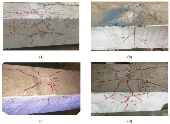 Crack patterns for impact specimens after the residual static tests: (a) Specimen NR-I; (b) Specimen CG-I; (c) Specimen CGC-I; (d) Specimen CS-I.