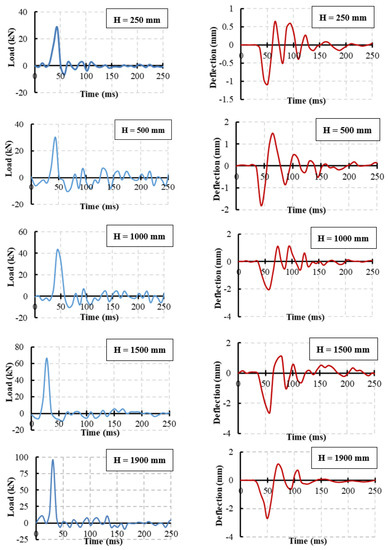 When the hammer hit the beam, the hammer’s momentum was rapidly transferred to the beam. As a response, the hammer’s momentum was reduced. This resulted in a reduction in the hammer’s kinetic energy and an increase in the beam’s energy. This sudden energy transfer between the hammer and the beam led to a rapid build-up of stress in the beam. The momentum () is obtained from Equation (3). The impact characteristics of the impact tests are listed in Table 4.