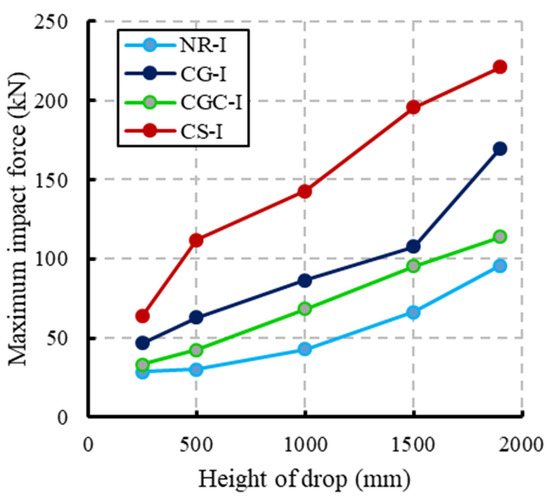 The impact load and deflection time histories for each specimen were recorded for each height. Figure 8 illustrates the specimen NR-I’s impact force and mid-span deflection time histories as an example of the impact response. The first pulse’s peak grew in proportion to the drop height, whereas the initial pulse-like waveform had a duration of about 25 ms regardless of the drop height. The length of the blunt waveform grew as the drop height increased, but the peaks of the blunt waveforms were approximated independently of the drop height. The maximum mid-span deflection increased as the drop height increased. Comparisons of the maximum impact force and maximum mid-span deflection of specimens NR-I, CG-I, CGC-I, and CS-I for different heights are listed in Table 6 and shown in Figure 9 and Figure 10, respectively.