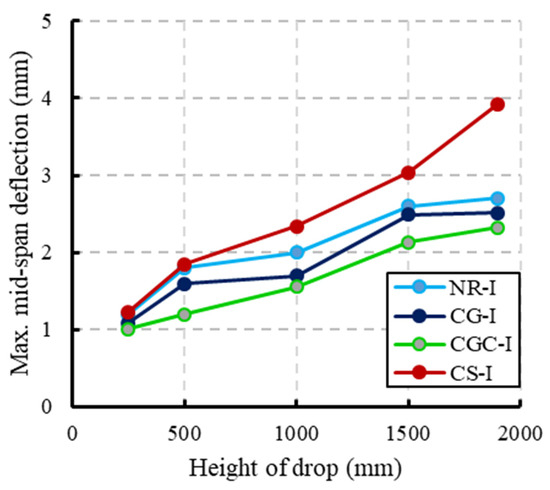 Figure 9 shows that the maximum impact force increased as the drop height increased. For the composite specimen CS-I, the maximum impact force was 130% greater than the reference specimen NR-I at a drop height of 1900 mm whereas the maximum impact forces for specimens CG-I and CGC-I were 19% and 77%, respectively, more significant than the reference beam at the same drop height. The high stiffness for the steel I-beams relative to the GFRP I-beams was the reason for this difference in behavior, where the impact force is proportional to the structural stiffness. As seen in Figure 10, the composite specimens CG-I and CGC-I showed reductions in the corresponding mid-span deflections relative to the reference specimen NR-I. For the 1900 mm drop height, reductions of 10.7% and 14.1% were obtained, respectively, whereas the composite specimen CS-I showed a 45% increase in the corresponding mid-span deflection due to the high impact force caused by the section’s high stiffness.