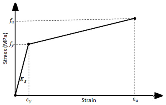 The steel I-beam, longitudinal steel rebars, and stirrups were modeled as a non-linear relationship adopted by [15], as shown in Figure 14. The linear isotropic part is defined by the modulus of elasticity of the reinforcement and Poisson’s ratio. The plastic part is defined by the yield stress fy, ultimate stress fu, and plastic strains, as illustrated in Figure 14. Using a combination of damage initiation criteria, the progressive damage model was employed to characterize the behavior of the pultruded profiles. Hashin’s criteria [17] were used to determine when the pultruded profile begins to degrade. After satisfying the damage initiation criteria, the material stiffness of the pultruded profile degrades according to the damage evolution law. Table 9 lists the values of engineering constants for elastic properties of GFRP material, the strength properties to represent the damage intuition criteria, and the parameters for the progressive damage model presented by damage evolution (fracture energy) and damage stabilization indicated by viscosity coefficients. The values in this table were determined by experimental tests and from the available works of literature [16,18] based on the type of fibers and matrix as well as trial and error.