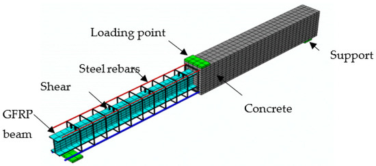 The numerical model employed the general static processes by using the displacement-controlled loading. The suggested model was validated using experimental data from the tested specimens NR, CG, and CGC. The assembled FE model for the composite specimen CGC is shown in Figure 15. The embedded technique with a complete bond was employed to simulate the interaction between the steel rebars and concrete as well as the GFRP profile and concrete.