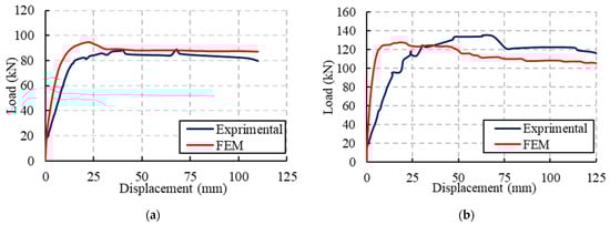 Figure 16 presents comparisons between the experimental and FE results in terms of the load-deflection relationships. The analyzed beams showed initially linear elastic behavior with a higher stiffness than the experimental results. These beams showed ±6% or less high capacities relative to the experimental results. The perfect bond assumed between the concrete and steel rebars as well as the GFRP profile was the main reason for this difference in response. Moreover, the boundary conditions, as well as the material constitutive models, were considered ideal in the numerical analyses relative to those in the experiments. In general, there was good agreement between the experimental and FE results under static loading.