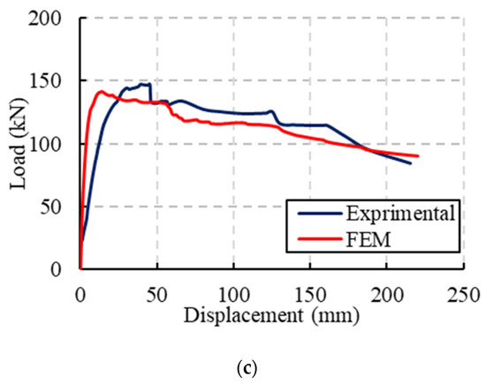 Validations of the FE results for static loading: (a) Specimen NR; (b) Specimen CG; (c) Specimen CGC.