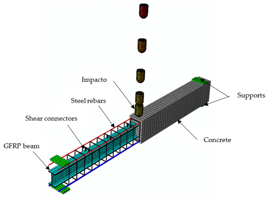 The concrete, shear connectors, and steel I-profile were modeled using three-dimensional eight-node elements with reduced integration (C3D8R). The longitudinal and transverse steel reinforcement were modeled using three-dimensional truss elements (T3D2) with a linear kinematic hardening model. The pultruded GFRP I-profile was simulated using an 8-node doubly curved thick shell element with reduced integration (S8R). The impactor in the impact loading case was modeled by a discrete rigid shell that rotated 360° to create the cylindrical shape.