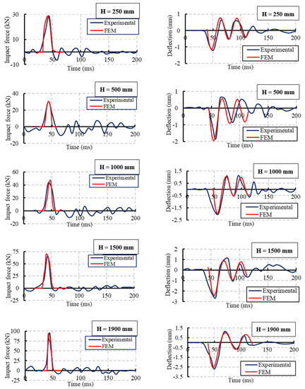Comparisons between the FE and experimental results of the impact force and mid-span deflection time histories for specimen NR-I, as an example, are shown in Figure 18. The numerical simulations and experiment results were validated using five impact hits. Good agreement between the experimental and FE results was obtained. The difference between the maximum impact loads in the FE model and the experimental result was 10% of all specimens. Moreover, this difference was about 6% of the mid-span deflections for all specimens.