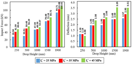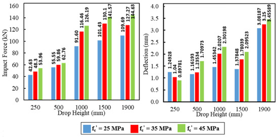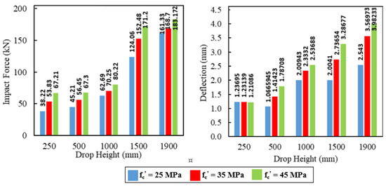 The concrete compressive strengths 25 MPa, 35 MPa, and 45 MPa were examined to determine their influences on the load capacity and corresponding mid-span deflection under the effect of impact loads. Figure 20, Figure 21 and Figure 22 show these influences for the five impact hits. Relative reductions were noticed in the deflections at the maximum impact load for the first hit (H = 250 mm), whereas increases were observed for the other hits. The first hit had a more negligible effect on the behavior of the analyzed model. Therefore, the deflection in the first hit had a behavior similar to that of deflection in the static loading.
