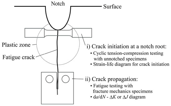 The LCF life of components is generally evaluated on the basis of a combination of the durations of crack initiation and crack propagation [1]. Figure 1 shows a schematic illustration of a life evaluation technique for a notched component. For crack initiation, stress–strain hysteresis at a notch root that is plastically deformed due to an applied load is analyzed, and the crack initiation life is estimated based on the LCF data of a material obtained on smooth (unnotched) specimens under cyclic uniaxial loading, such as tension–compression (T/C). For crack propagation, a fracture mechanics parameter, such as stress intensity factor K or J-integral for a crack propagating from the notch root, is analyzed, and the crack propagation life is estimated based on the crack propagation properties of the material (da/dN-ΔK or da/dN-ΔJ relations). If the evaluation of crack initiation life is made using the above procedure, stress–strain distributions near a stress/strain raiser are ignored. Although a few studies related to LCF life evaluation considering a strain gradient have been recently reported [2,3], the understanding of the influence of strain distribution on fatigue life is still insufficient to apply it to the life prediction of components in the LCF regime. In contrast, it is well known that stress distribution affects fatigue life in the HCF regime, and Peterson [4], Neuber [5], Ishibashi [6], and Siebel et al. [7] formulated the fatigue limit taking the stress gradient into account. Recently, Ye et al. [8] proposed a technique to predict the fatigue life of notched specimens taking into account stress and its gradient. They demonstrated that the fatigue life of notched specimens with different notch sizes could be evaluated using this technique.