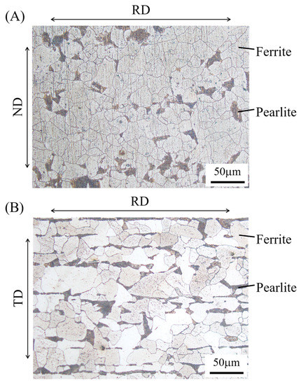 Microstructure of the steel used in this study: (A) upper surface and (B) side surface of an as-received steel plate. Note: TD—thickness direction, ND—normal direction, and RD—rolling direction.