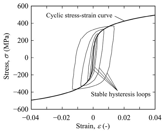 According to this procedure, the stress–strain hysteresis at the specimen edge could be drawn, as shown in Figure A3B. Note that this procedure can derive only the unloading curves from the maximum stress to zero stress. The curves from zero to the maximum stress were estimated as smooth curves from zero to the maximum stress (dotted lines) by considering the cyclic stress–strain curve. This was not a problem because the curves were not used for the life evaluation via the strain-based approach.