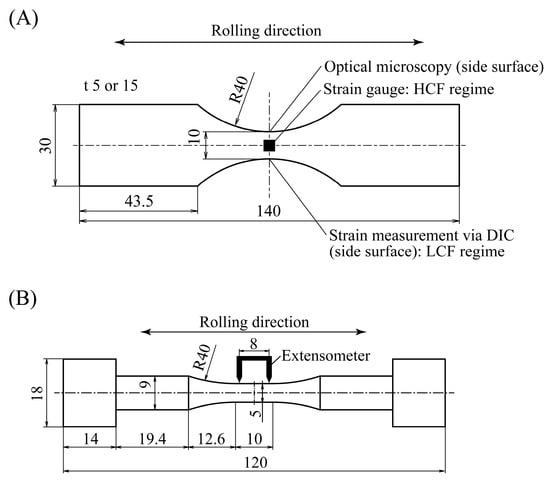 Cyclic T/C tests were conducted under displacement-controlled conditions with a displacement ratio of −1 and frequency of 0.1 Hz in the LCF and HCF regimes. An extensometer with a gauge length of 8 mm was attached to a parallel portion of the specimen, as shown in Figure 4B, and the displacement was measured during testing. The ranges of stress, elastic strain, and plastic strain were determined based on uniaxial stress–strain hysteresis curves. Note that the stress and strain of the T/C specimen can be experimentally derived as the applied load divided by the original section at the parallel portion and the displacement divided by the gauge length, respectively, which is different from the case of the bending specimen. The testing was also terminated when the load dropped by more than 50% from the maximum load.
