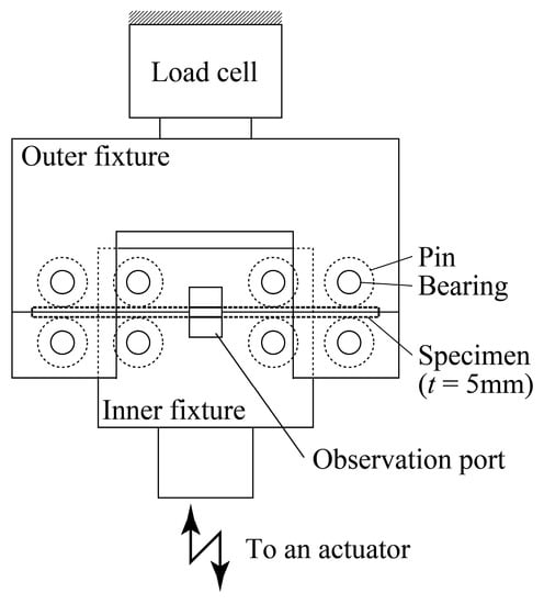 The cyclic bending tests developed by the authors were conducted. Figure 5 shows a schematic illustration of a testing apparatus for a specimen with a thickness of t = 5 mm. The specimen is mounted between cylindrical pins with a diameter of 20 mm, which can freely rotate via roller bearings attached to upper and lower fixtures. The inner and outer spans are 60 and 120 mm, respectively.