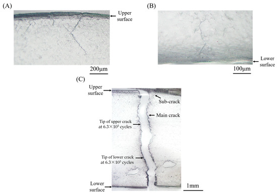 Figure 6 shows some edge cracks that occurred in the bending specimen (t = 5 mm) subjected to Δεt = 0.015, which was obtained using the replica technique. At the number of cycles N/Nf = 0.87, cracks were observed at the upper and lower surfaces and propagated from the surfaces toward the specimen center (see Figure 6A,B). Note that some cracks were initiated, which is clearly observed at the upper surface shown in Figure 6A. Then, cracks propagating from the upper and lower surfaces coalesced around the center, and the specimen was fractured (see Figure 6C). The sites of crack tips just before fracture (N = 6.3 × 103 cycles) are indicated in this figure. The upper and lower cracks were almost equal in length, and it was considered that the cracks coalesced in the center of the specimen, and the specimen was fractured. These trends in crack initiation, propagation, and fracture were the same as those in the other specimens, irrespective of specimen thickness.