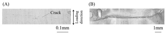 Figure 7 shows a crack occurring in the T/C specimen subjected to Δεt = 0.028. A crack along the plane perpendicular to the loading direction was initially observed at N/Nf = 0.12 (see Figure 7A). Then, the crack propagated along the plane, and the specimen was fractured, as shown in Figure 7B. These trends were almost the same for all T/C specimens within the scope of this study. Comparing these results, the fatigue processes are summarized as follows. In the bending specimens, cracks occurred at the upper and lower surfaces and propagated, and the fracture was caused by the coalescence of these cracks around the specimen center. On the other hand, in the T/C specimens, a crack occurred and propagated along the plane perpendicular to the loading direction, and the fracture occurred.