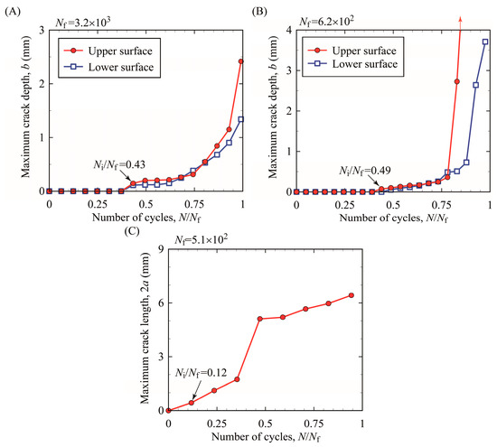 The length of cracks was measured to compare crack initiation and propagation lives of bending and T/C specimens. Figure 8 shows the changes in crack lengths in the specimens subjected to a total strain range, Δεt, of approximately 0.02. In the horizontal axis, the number of cycles, N, is normalized by the number of cycles to total failure, Nf. As multiple cracks occurred, the depth/length of the deepest/longest crack was measured for each specimen. The number of cycles to crack initiation is also shown in this figure, defined as the number of cycles where a crack longer than 0.1 mm was first observed. The crack length/depth of 0.1 mm corresponds to a micro-crack propagating only through a few grains, which would be reasonable for the crack initiation condition from a microstructural viewpoint [26]. In the specimens subjected to cyclic bending, cracks occurred at both surfaces at nearly a half of total failure life (N/Nf ≃ 0.5), and then, cracks at the upper and lower surfaces propagated rapidly after N/Nf ≃ 0.75. On the other hand, in the T/C specimen, a crack occurred very early, propagated steadily, and then, the total failure occurred. Note that the crack initiation life of the T/C specimen shown in Figure 8C was estimated as N/Nf = 0.12, which might be an overestimation because the observation interval is not sufficient as in other specimens.