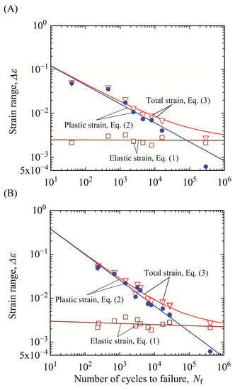 The crack initiation life, Ni, and total failure life, Nf, were characterized by the strain-based approach: the relationships between elastic strain range and life (Δεe–N) and between plastic strain range and life (Δεp–N) were characterized by the Basquin law, as in Equation (1), and the Coffin–Manson law, as in Equation (2), respectively: