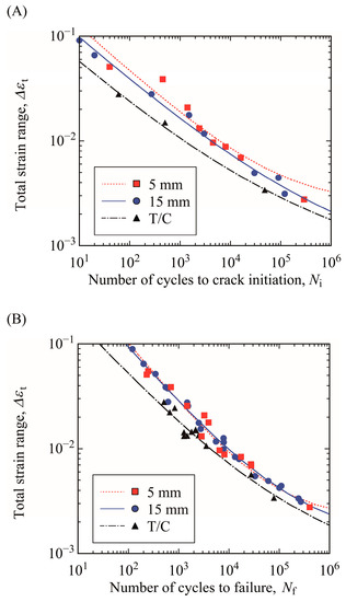 Figure 10A,B shows the relationships between total strain range and crack initiation life and between total strain range and total failure life (Δεt–Ni and Δεt–Nf relations), respectively. The curve representative of fatigue life for each loading condition is drawn using the strain-based approach of Equation (3) derived from Equations (1) and (2). The crack initiation life of T/C testing was the shortest in the test conditions in this study. The crack initiation life of the specimen with a thickness of 15 mm was slightly shorter than that of the specimen with a thickness of 5 mm from the LCF to HCF regimes, indicating that the influence of plate thickness on crack initiation life must be considered. The total failure life of T/C testing was also the shortest. However, the total failure life of the specimen with a thickness of 15 mm was almost the same as that of the specimen with a thickness of 5 mm.