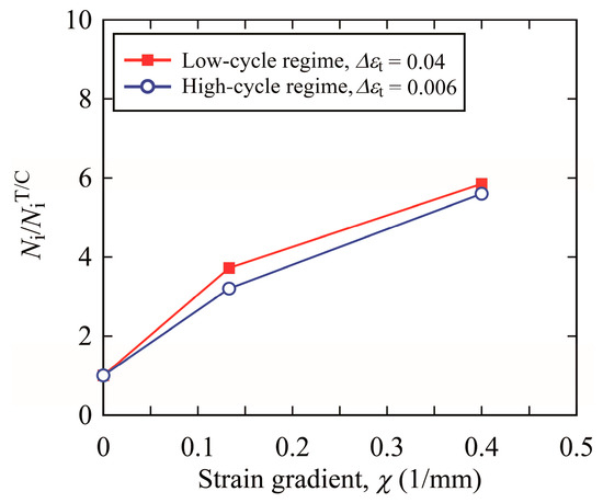 In the case of the T/C specimen, χ became null due to no strain gradient in the cross-section of the specimen. Figure 11 shows the relationship between crack initiation life, Ni, and strain gradient, χ, under the conditions of Δεt = 0.04 (LCF regime) and 0.006 (HCF regime). In the vertical axis, the crack initiation life, Ni, is normalized by that for the T/C testing, NiT/C. The crack initiation life, Ni/NiT/C, increased with increasing strain gradient, and the increasing trend seems to be almost the same. Hence, it was found that the crack initiation life must be evaluated using strain and its gradient in LCF and HCF regimes.