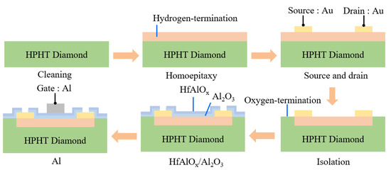 Fabrication process of the H-terminated diamond FET with HfAlOx/Al2O3 bilayer dielectrics.