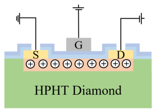 The diamond is considered as an ultimate semiconductor with ultrawide bandgap of 5.47 eV, extremely high breakdown field of 10 MV/cm, highest thermal conductivity of 22 W/cm·K, high carrier mobility (electrons of 4500 cm2/V·s, holes of 3800 cm2/V·s) and large carrier saturation velocity (electrons of 1.5–2.7 × 107 cm/s, holes of 0.85–1.2 × 107 cm/s) [1,2,3,4]. Since the dopants cannot be activated at room temperature with high activation energy (boron of 370 meV and phosphorous of 650 meV) [5], the application of diamonds has been greatly hindered. In this case, δ-doping comes into being. However, this technique requires the precise control of the doping thickness, and the carrier mobility is not ideal [5]. Fortunately, a hydrogen-terminated (H-terminated) diamond with two-dimensional hole gas (2DHG) channel provides a new solution to overcome these problems, which demonstrates a high carrier density of 1013 cm−2 and large carrier mobility of 50–200 cm2/V·s [3,6]. To date, as a promising structure of diamond-based electronic devices, the H-terminated diamond field effect transistor (FET) has aroused the great interest of researchers [7,8,9,10,11,12,13,14,15,16,17,18,19,20,21].
