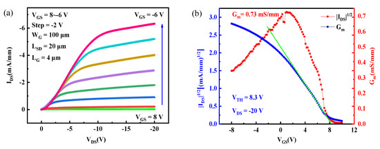 Figure 3a demonstrates the drain source current density (IDS) versus drain source voltage (VDS) at different gate voltages (VGS) of the H-terminated diamond FET with HfAlOx/Al2O3 bilayer dielectrics. The gate length (LG), gate width (WG) and LSD for the device are 4 μm, 100 μm and 20 μm, respectively. The VGS varies from 8 to −6 V in a step of −2 V. The absolute value of IDS (|IDS|) increases as the absolute value of the VGS (|VGS|) increases, indicating the existence of a p-type channel. The maximum IDS (IDSmax) is −6.3 mA/mm obtained at a VGS of −6 V and a VDS of −20 V. The IDSmax is relatively large compared with our previous work [13,23], and the reason may be attributed to the undamaged 2DHG conduction channel protected by Al2O3.