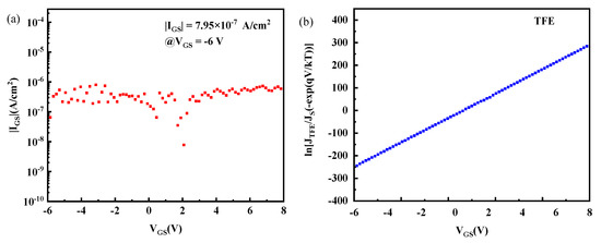 where JTFE means the IGS caused by TFE model; JS represents the saturation current; and P is a parameter associated with the carrier tunneling probability and temperature [9]. In Figure 4b, the lnJTFE/JS(−exp(qV/kT)) and VGS exhibit a linear relationship under the TFE model.