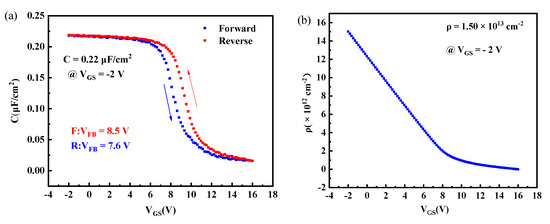 Figure 5a displays the capacitance-voltage (C-V) curve measured at 1 MHz of the H-terminated diamond FET with HfAlOx/Al2O3 bilayer dielectrics. Evident accumulation and depletion regions can be observed. The maximum capacitance (COX) is 0.22 μF/cm2 at VGS of −2 V. Based on the method d2C/d2VGS = 0, the flat band voltage (VFB) is determined to be 8.5 V and 7.6 V in the forward and reverse directions, respectively [18]. The trapped charge density is evaluated to be 1.24 × 1012 cm−2 based on the hysteresis voltage of 0.9 V [8]. Additionally, the CV curve shifts to the positive direction, indicating the presence of fixed negative charge in the dielectric layer. This increases the hole carriers in the 2DHG channel, thus resulting in a normally-on operation. The fixed negative charge density is deduced to be 1.25 × 1013 cm−2 on the basis of COX, VFB, and the work function difference between Al and the H-terminated diamond [8]. In addition, the dielectric constant of HfAlOx/Al2O3 is calculated to be 8.45, suggesting that the quality of HfAlOx/Al2O3 needs to be further improved. As demonstrated in Figure 5b, the carrier density (ρ) is 1.50 × 1013 cm−2 at the VGS of −2 V evaluated based on [18]. The ρ is large, and this can be attributed to the high quality of the H-terminated diamond [8,21].