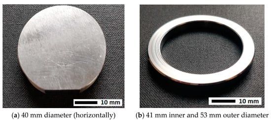 The application uses a ball bearing steel, so laboratory test parts of this material were used for process development, 40 mm diameter and 10 mm thick (see Figure 1a), whilst the ring-shaped parts used in the real-life ship engine application are 53 mm outer diameter, 31 mm inner diameter, and 5 mm thick. The edges of the demonstrator (ring-shaped parts) were chamfered. The surfaces of the samples were ground to a surface roughness of Ra 0.4.