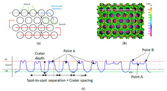 For low values of spot-to-spot spacing (50–55 µm), consecutive/adjacent features overlap with the previous ones, leading to features not being fully formed (see Figure 7a). When the spot-to-spot spacing is increased, full well-defined craters are observed (see Figure 7b). As a result, the height of the peaks is also higher for the greater spacings. However, the heights of the peaks at points A and B are significantly different in the intermediate range of spacings from 60 to 75 µm, due to a pile-up of melt at point B. Hence, a spot-to-spot spacing of 80 µm was chosen to provide the most uniform surface, leading to the highest contact area between laser-textured samples and the counterparts.